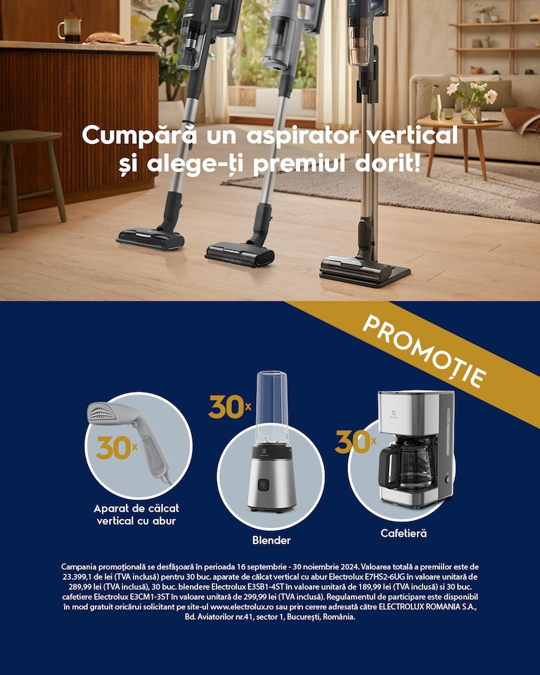 Dacă ai achiziţionat un aspirator vertical Electrolux din promoţie în perioada 16 septembrie - 30 noiembrie 2024, te poţi înscrie în campanie!