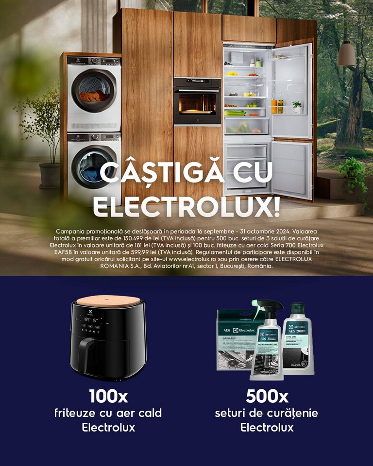 După încheierea promoţiei, toţi participanţii validaţi intră automat în tragerea la sorţi pentru 100 de friteuze cu aer cald Seria 700 Electrolux, din data de 20 noiembrie 2024.