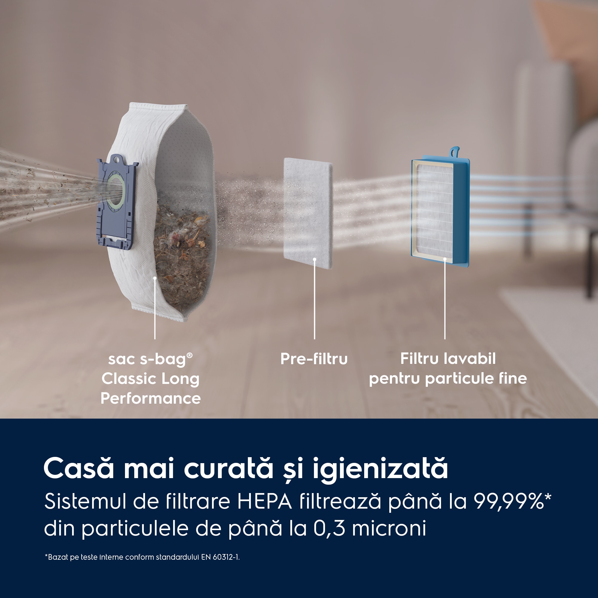 *Pe baza testelor externe de filtrare a microparticulelor de praf cu dimensiuni cuprinse între 0,3 și 10 microni conform standardului EN 60312-1 utilizând particule de nisip/praf standard.