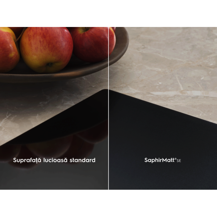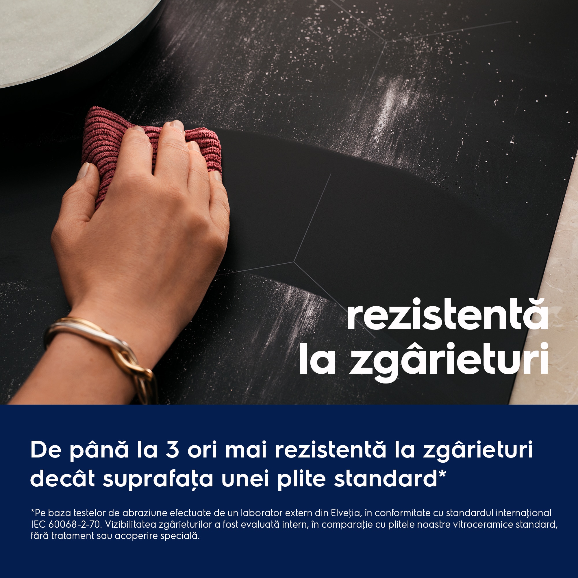 *Pe baza testelor de abraziune efectuate de un laborator extern din Elveţia, în conformitate cu standardul internaţional IEC 60068-2-70. Vizibilitatea zgârieturilor a fost evaluată intern, în comparaţie cu plitele noastre ceramice standard, fără tratamente sau acoperiri speciale.
