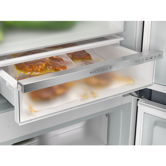 Sertarul reglabil MultiChill 0° îţi oferă o experienţă de gătit superioară și este optimizat pentru depozitarea cărnii și a peștelui. Prin aplicaţie poţi activa programe dedicate, precum răcirea rapidă a băuturilor, decongelarea sigură a alimentelor sau păstrarea resturilor în condiţii ideale.