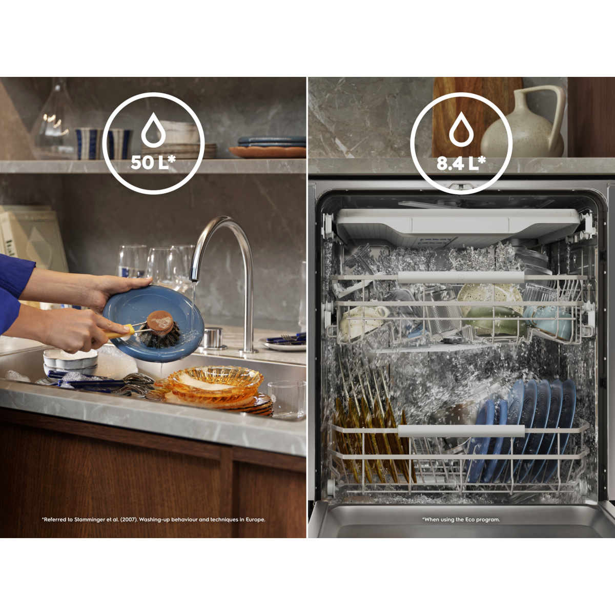 Seria 700 oferă eficienţă și încărcare ușoară. Vase strălucitor de curate cu doar 8,4 litri de apă și spaţiu generos în coșurile flexibile, cu secţiuni rabatabile.