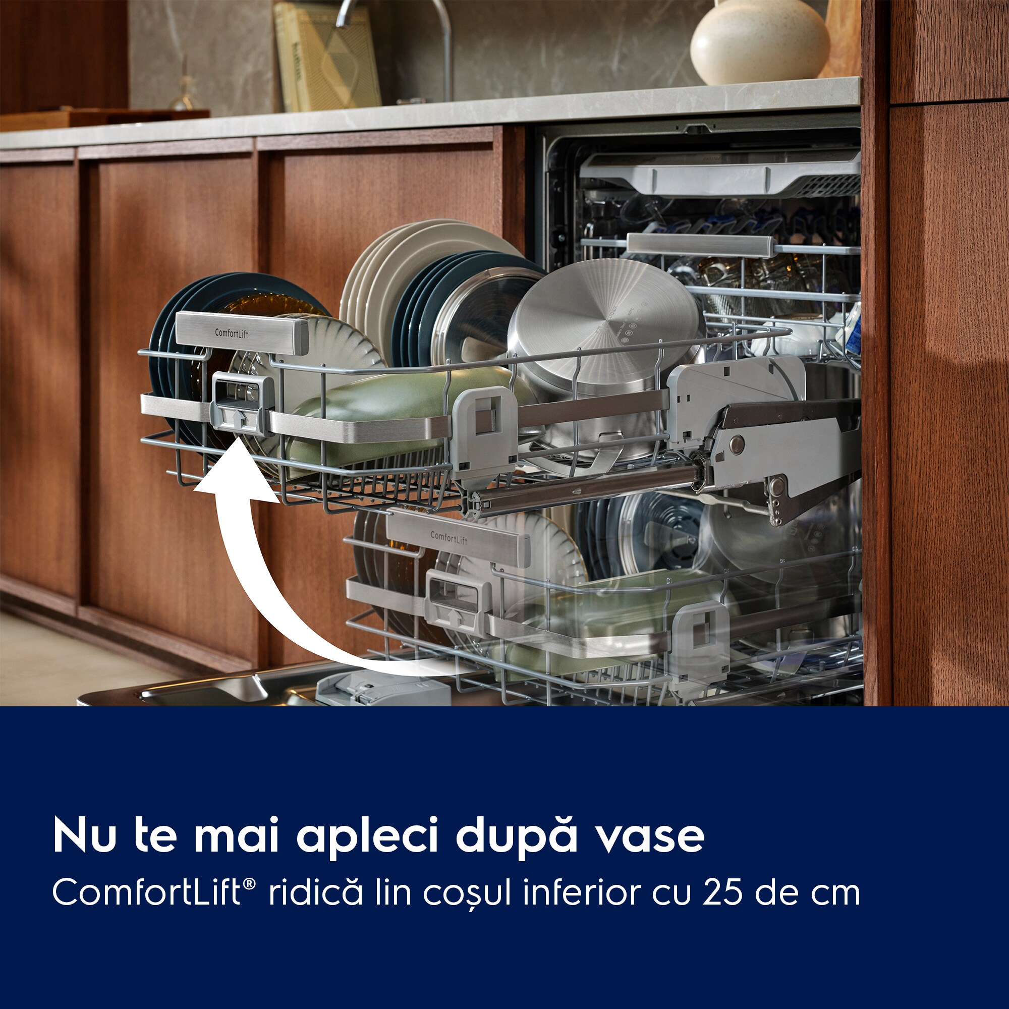 Curățare fără efort. În coșurile versatile ale gamei 900 încap chiar și boluri de supă, carafe și pahare de vin, iar sertarul ajustabil pentru tacâmuri are loc inclusiv pentru ceșcuţe mici. Puterea de curăţare elimină reziduurile persistente cu un consum minim de apă.