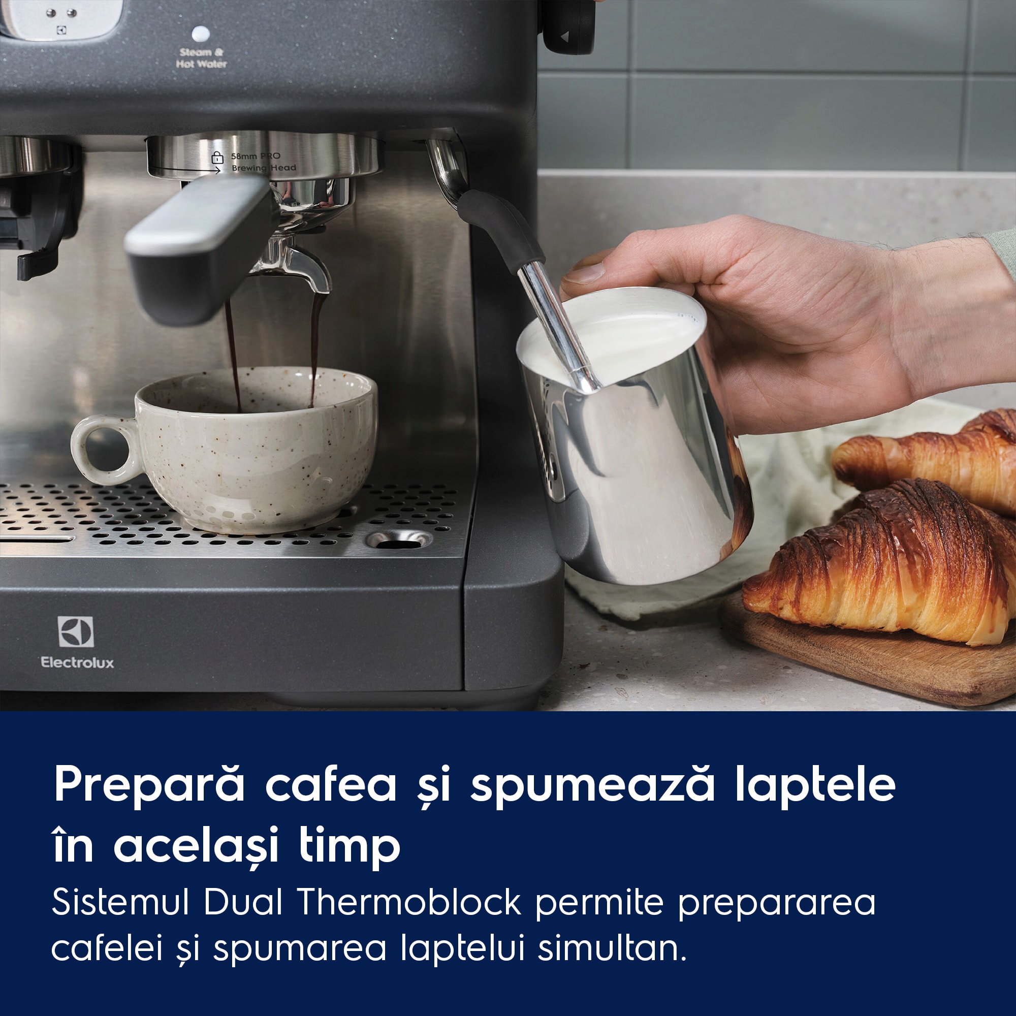 Tehnologia Dual Thermoblock asigură temperaturi constante pentru prepararea cafelei și pentru spumarea laptelui. În plus, îţi poţi pregăti cafeaua și spuma de lapte în același timp.
