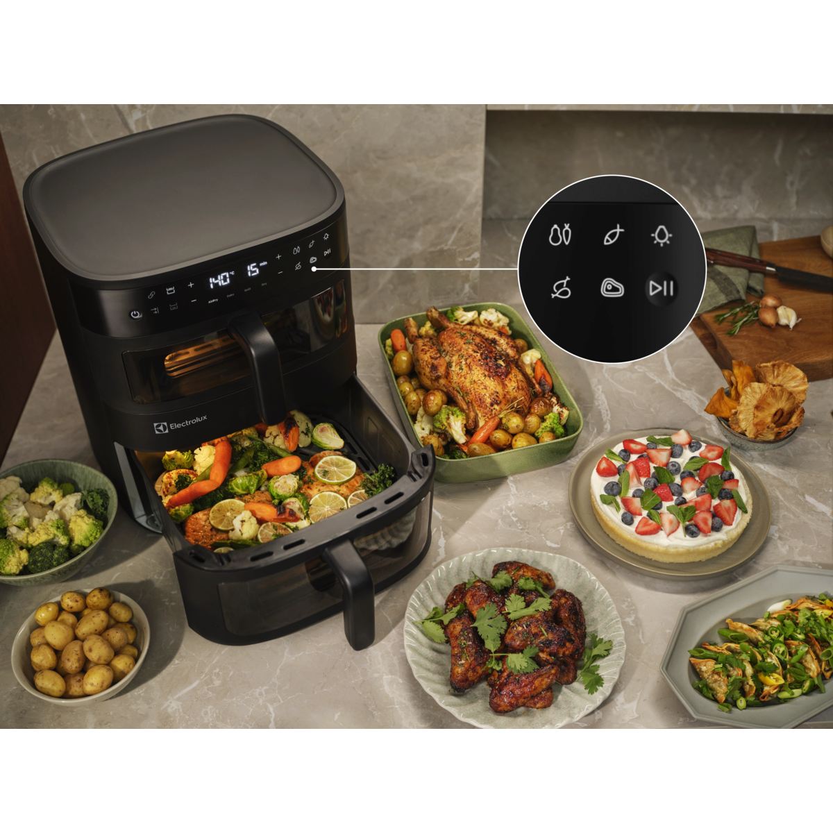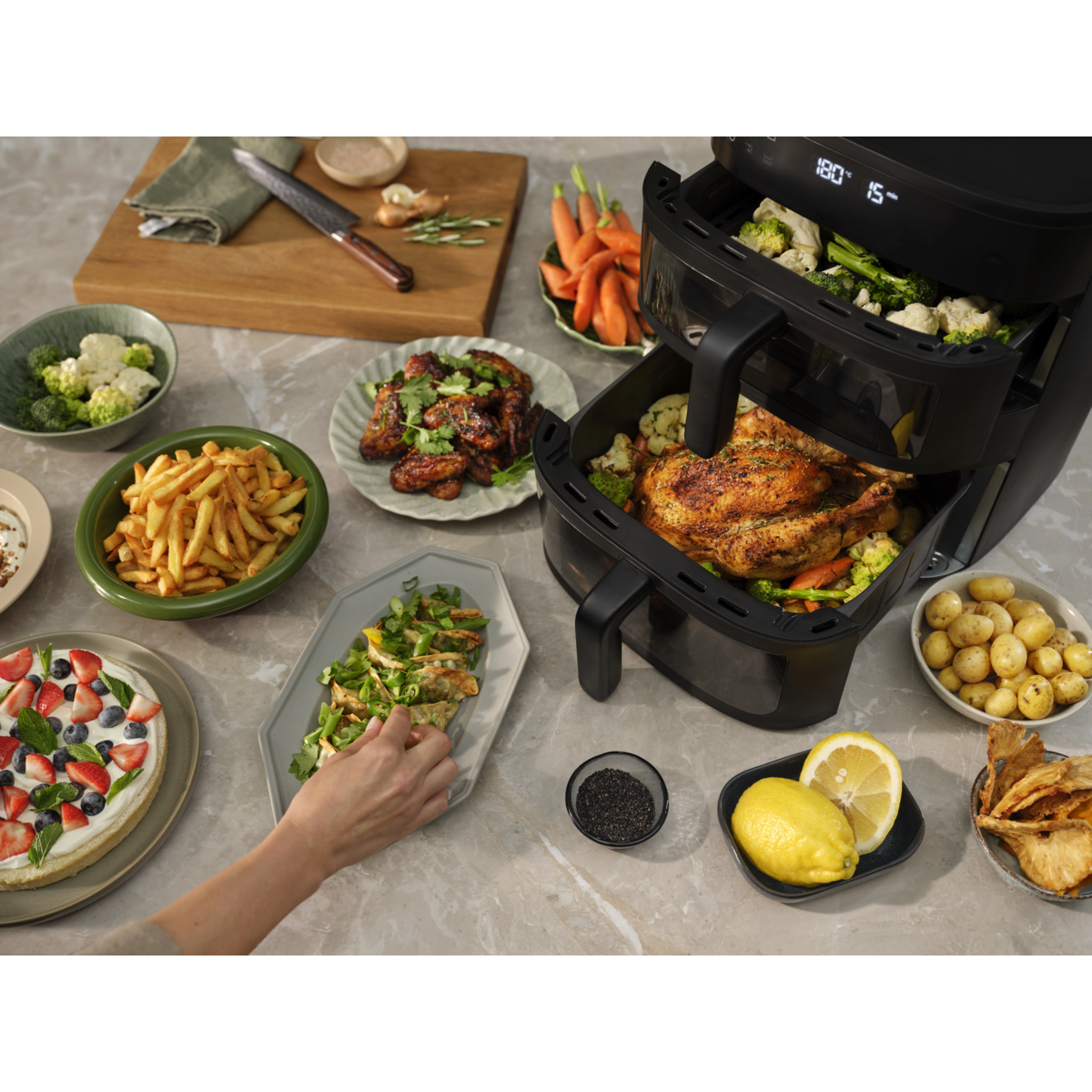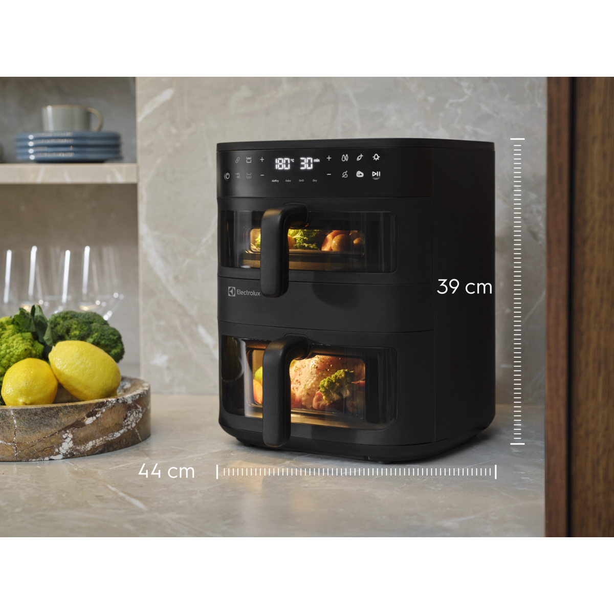 Gătește pentru întreaga familie cu friteuza cu aer cald Dual Electrolux 800. Coșurile verticale duble și ferestrele cu lumină interioară îţi permit să gătești și să monitorizezi două preparate sau unul singur mai mare, cu căldură egal distribuită pentru rezultate perfecte.