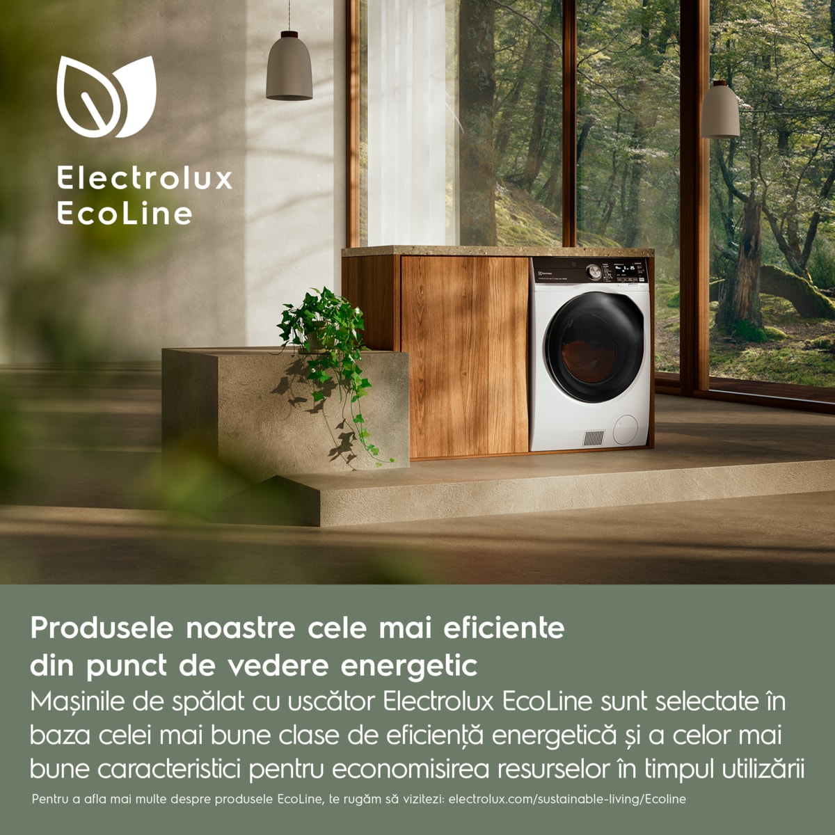 Mașinile de spălat rufe cu uscătoare Electrolux EcoLine sunt selectate pe baza celui mai mare calificativ energetic al nostru. Economisește până la 96% apă cu programul cu abur și redu utilizarea de energie cu 55% în timp ce usuci și cele mai delicate țesături precum lâna, mătasea sau puful, datorită tehnologiei cu pompă de căldură.*