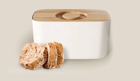 Cutia pentru pâine cu design scandinav Joseph Joseph™ este realizată din melamină de calitate, cu un capac din lemn de fag. Capacul are funcția de tocător pentru pâine și este prevăzut cu șanțuri pentru a bloca firimiturile să cadă. Această cutie multifuncțională poate fi introdusă în siguranță la mașina de spălat vase.