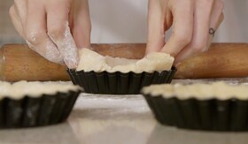 2. Imparte aluatul in 4 parti egale si intinde bucatile de aluat cu un sucitor. Asaza fiecare bucata in tavite speciale pentru mini tarte.