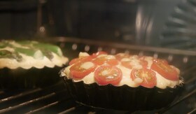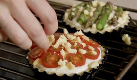 4. Amesteca branza ricotta cu ou si asezoneaz-o cu sare si piper. Umple cele 4 mini tarte cu aceasta compozitie, apoi asaza deasupra bucati de sparanghel, rosii cherry si branza Cheddar.