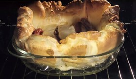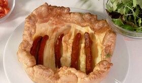 3. Scoate cu grija tava si toarna aluatul pregatit mai devreme in uleiul incins. Asaza deasupra carnaciorii picanti si da din nou la cuptor la 180C, cu functia PlusSteam activa, pentru inca 20-30 minute sau pana creste in volum si devine auriu. Lasa la racorit in tava apoi transfera pe un platou.