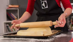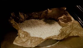 2. Pune o foaie de copt in tava, peste aluat, si toarna inauntru boabe de fasole sau orez. Coace in cuptorul aragazului PlusSteam, preincalzit la 180°C, cu functia PlusSteam activata, pentru 15 minute.