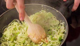3. Intre timp, pregateste umplutura: incalzeste untul intr-o tigaie si adauga baconul, gatindu-l pana se aureste. Apoi, transfera-l intr-un bol, iar in grasimea ramasa in tigaie, adauga ceapa si usturoiul si gateste 2-3 minute sau pana se inmoaie si incep sa devina translucide. Adauga prazul si gateste cateva minute pana se inmoaie. Lasa la racit intr-un bol.