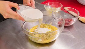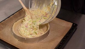 4. Amesteca ouale si galbenusurile cu o furculita, apoi toarna-le peste praz. Adauga si restul ingredientelor. Asezoneaza dupa gust daca consideri necesar.