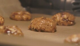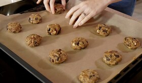 2. Intinde o foaie de hartie de copt intr-o tava intinsa. Modeleaza bile de marime medie din aluat si asaza-le in tava lasand suficient spatiu intre ele. In timpul coacerii ele se vor intinde si vor lua forma unor biscuiti.