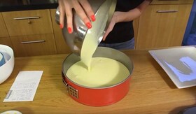 4. Pentru glazura amesteca smantana cu zaharul si zeama de lamaie si toarn-o deasupra cheesecake-ului, dupa ce il scoti din cuptor. Baga tava inapoi in cuptor pentru inca 20 de minute, dupa care lasa cheesecake-ul sa se raceasca inauntru, cu usa deschisa. Cand s-a racit de tot, baga-l la frigider pentru minim 3 ore inainte de a fi savurat impreuna cu sosul de fructe.