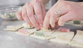 3. Taie fiecare fasie de aluat in tringhiuri. Asaza o bucata de rahat la capatul fiecarui triunghi, apoi ruleaza strans.