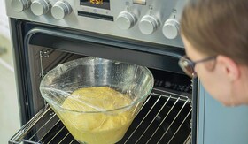 4. Acopera bolul cu folie alimentara si lasa la crescut 40 minute in cuptorul preincalzit la cea mai joasa temperatura, activand functia PlusSteam. In tot acest timp, aluatul isi va dubla sau tripla volumul.