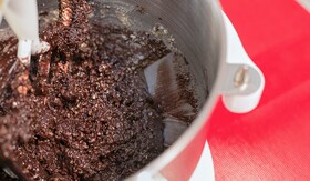 380g miez de nuca, macinat 250g zahar pudra 70g cacao pudra 160g oua intregi 15g coaja rasa de portocala 200g rahat, taiati cuburi |