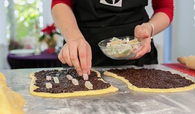 6. Imparte aluatul in trei parti egale apoi asaza-l pe masa de lucru infainata. Taie fiecare bucata in doua apoi ruleaza cu un sucitor fiecare parte de aluat intr-o foaie subtire. Aplica crema de ciocolata si nuca cu o spatula, apoi presara rahat taiat cuburi sau fasii. Ruleaza strans fiecare foaie de aluat, apoi impleteste-le.