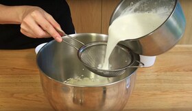 2. Amestecati cele 5 galbenusuri cu cele 100 de gr de zahar folosind functia de mixer a robotului de bucatarie Kitchen Assistent timp de 3-4 minute la viteza maxima. Preincalziti cuptorul la 100 de grade Celsius pe functia Aer Cald Ventilat. Amestecati crema de galbenusuri cu lichidul caldut din craticioara.