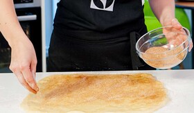 3. Amesteca zaharul brun, cel alb si scortisoara intr-un bol. Intinde aluatul intr-o foaie subtire, apoi intinde deasupra untul topit, dupa care presara amestecul de scortisoara si zahar.