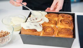 5. Mixeaza crema de branza cu untul si zaharul pudra plus vanilia intr-un bol. Toarna crema peste melcii copti apoi presara nuci.
