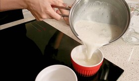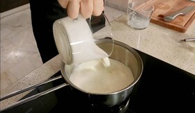 1. Pune foile de gelatina la inmuiat intr-un bol cu apa, apoi toarna intr-o craticioara laptele si smantana pentru frisca. Adauga zaharul si semintele batonului de vanilie.