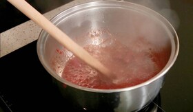 3. Pentru topping poti folosi orice doresti. Noi am ales sa facem un sos de zmeura foarte usor de preparat: intr-o craticioara adauga fructele spalate foarte bine, dupa care adauga atat zahar cat iti place. Lasa sa se formeze caramelul si sa se imbine armonios cu fructele pana devine un sos.