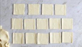 1. Se amesteca faina, sarea si praful de copt intr-un bol mare. Se adauga untul putin cate putin pana se obtine un aluat faramicios. Se adauga smantana in compozitie. Aluatul astfel obtinut va fi pregatit pe un blat de lucru, tapetat cu faina. Se framanta aluatul pe blat si se adauga faina pana cand acesta nu se mai lipeste de maini. Se foloseste un facalet pentru a intinde aluatul astfel obtinut, pana ajunge sa aiba 3 mm grosime. Cu ajutorul unui cutit de taiat aluat se imparte coca in patratele (4x4 cm).