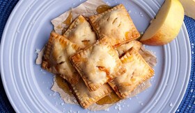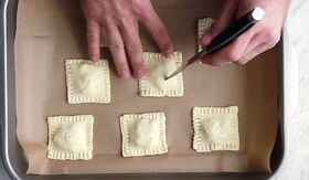 2. Se adauga, pe jumatate dintre patratelele obtinute, cateva bucatele de mar. Deasupra, se adauga putin caramel si sare de mare. Apoi, celelalte jumatati de aluat vor fi asezate peste cele umplute cu mar, caramel si sare de mare. Cu o furculita se preseaza fiecare latura a prajiturelelor. Deasupra, se fac trei mici crestaturi pe fiecare dintre prajiturile obtinute.
