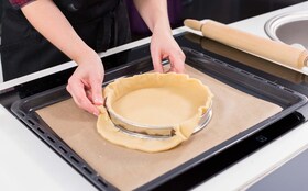 3. Pune aluatul pe masa de lucru usor infainata si intinde o foaie subtire. Decupeaza si formeaza crusta de tarta.