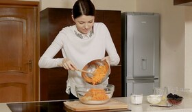 220 g de faina 10 g praf de copt 1 lingura de ghimbir proaspat dat prin razatoare 300 g morcovi rasi 80 g de miez de nuca macinat 150 g de zahar brun 125 g de unt topit 200 ml smantana pentru frisca 2 oua mari ecologice |