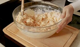2. Adauga apoi ingredientele lichide: ouale batute, smantana pentru frisca si untul topit. Amesteca-le cu grija si amestecul pentru blat e gata!