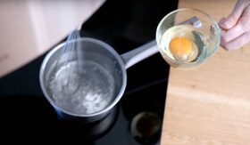 4. Se pune un vas cu apa pe plita, la fiert si se adauga otet. Se sparge un ou intr-o cana si se creeaza in oala cu apa fierbinte un vartej, cu ajutorul unui tel. Se pune oul in mijlocul vartejului si se asteapta in jur de 2 minute si jumatate, pana cand este gata. La fel se procedeaza pentru ouale posate ale celorlalti burgeri.