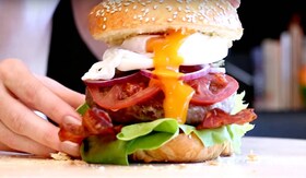5. Se prajesc intr-o tigaie burgerii cate 3-4 minute pe fiecare parte si se rumenesc cateva fasii subtiri de bacon la cuptor folosind programul Fast Grill. Se taie chiflele in doua, se unge partea de jos cu sos de rosii si maioneza, se asaza o frunza de salata si doua fasii de bacon, apoi chifteaua de vita, doua felii de rosii, rondele de ceapa, castraveti murati si oul posat. Se pune deasupra si cealalta jumatate a chiflei si se savureaza imediat. Pofta buna!
