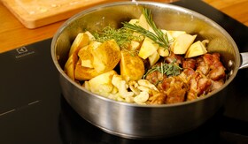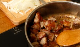 2. Cat timp acestea se gatesc, incinge o tigaie incapatoare cu 4 linguri de ulei pe treapta 12 a plitei cu inductie Electrolux. Adauga cubuletele de carne si prajeste-le timp de 4-5 minute, pana se rumenesc pe toate partile. Apoi scoate-le si pune-le deoparte. Adauga ceapa (nu schimba uleiul pentru ca vrei sa obtii cat mai multa aroma) si prajeste-o pe treapta de intensitate 9 a plitei cu inductie Electrolux. Las-o pe foc timp de 5-6 minute pana cand se inmoaie si incepe sa se rumeneasca. Adauga carnea inapoi in tigaie impreuna cu faina si gateste timp de 1 minut, amestecand bine.