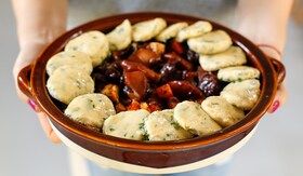 4. Intre timp, pregateste aluatul pe crusta frageda. In vasul de la robotul Kitchen Assistent adauga faina, praful de copt, un varf de sare, untul, untura de porc si patrunjelul tocat si amesteca folosind paleta din seria de accesorii ale robotului. Adauga apoi zeama de lamaie si mixeaza pana obtii un aluat moale si elastic. Modeleaza aluatul sub forma de disc (nu-l framanta, pentru ca se va intari) si decupeaza forme rotunde. Asaza-le apoi peste tocana. Folosind o pensula, intinde oul batut peste discurile de aluat.