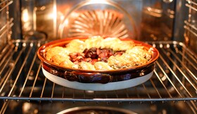 5. Schimba setarea cuptorului pe functia “Aer cald + abur”, la temperatura de 200°C, si toarna 300ml de apa in recipientul special. Da tocana la cuptor timp de 30 de minute, tot la nivelul trei al cuptorului, pana ce crusta de aluat se rumeneste bine.