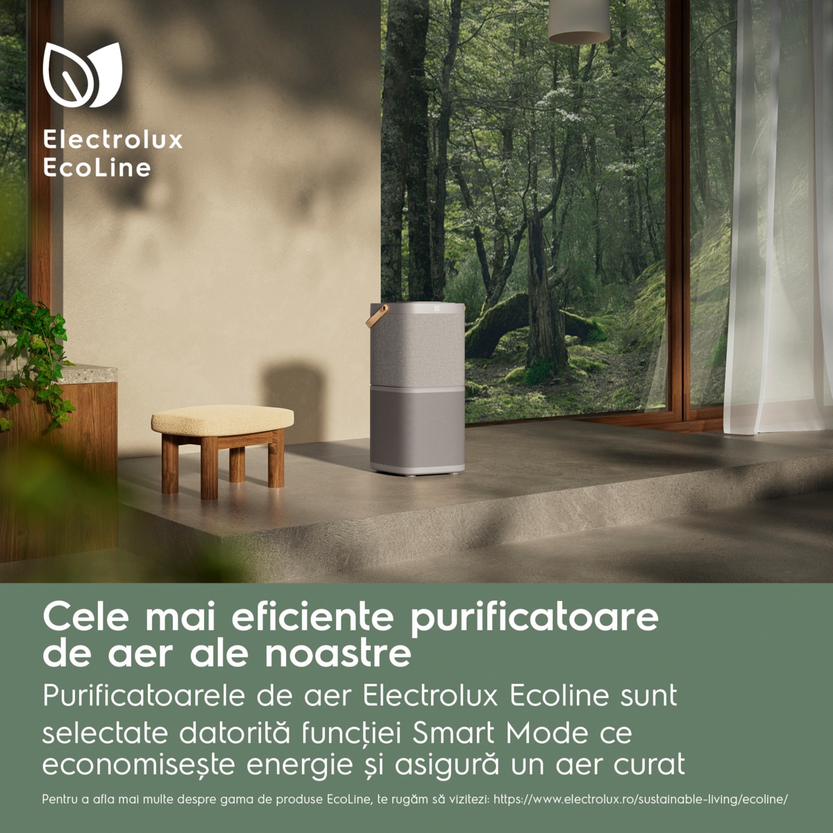 Acest purificator de aer Electrolux este cel mai eficient model al nostru, economisind până la 33% din energie cu Smart Mode*. Purificatoarele de aer din gama Electrolux EcoLine sunt selectate pe baza Smart Mode, care poate ajuta consumatorii să economisească energie în timpul utilizării.