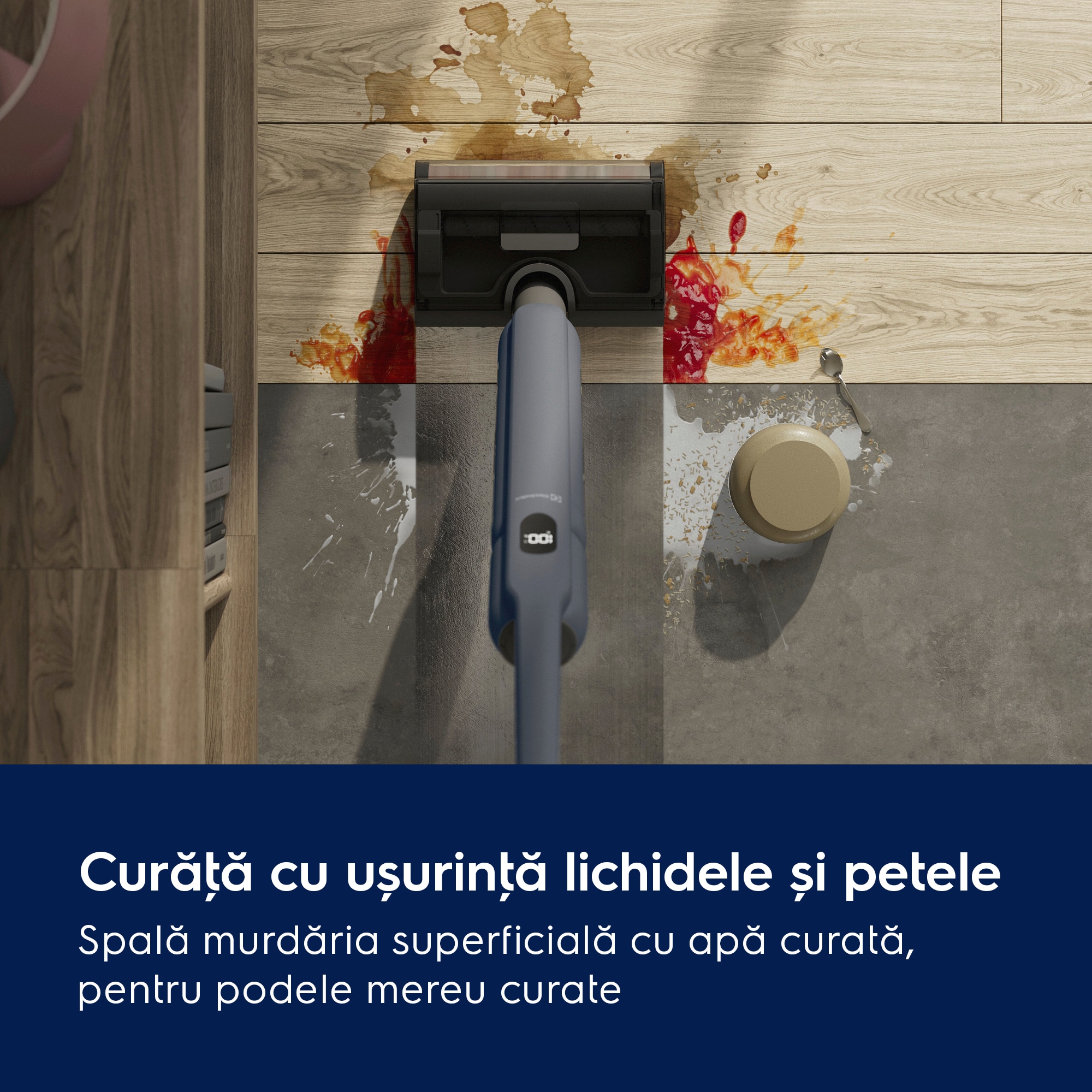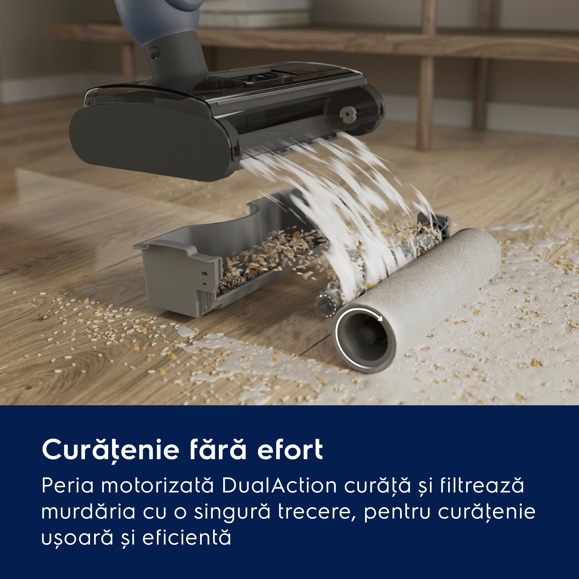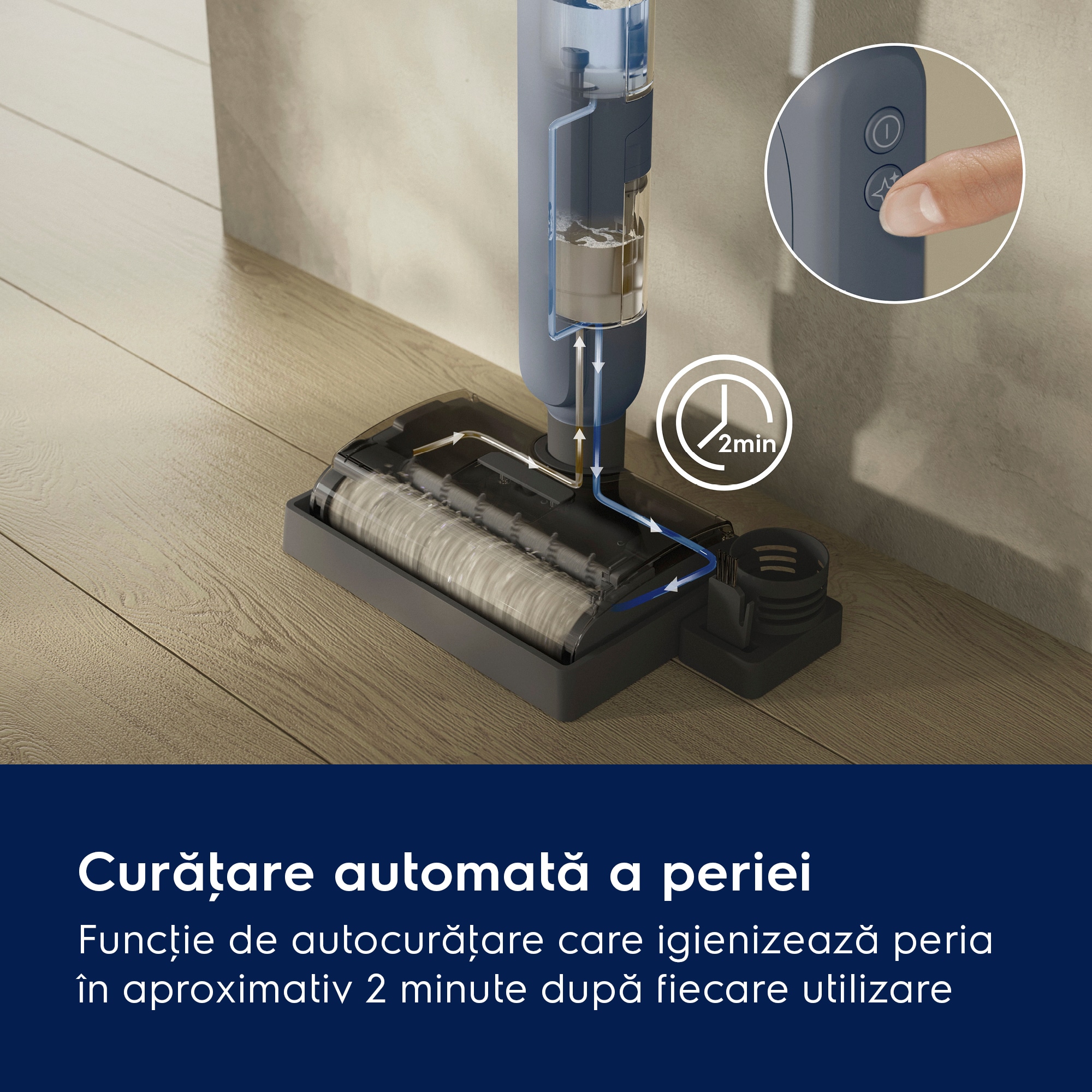 *Pe baza testelor interne de curăţare a petelor de pe pardoseli dure, plate, în comparaţie cu sistemul tradiţional cu mop și găleată, conform standardului IEC 62885-6.