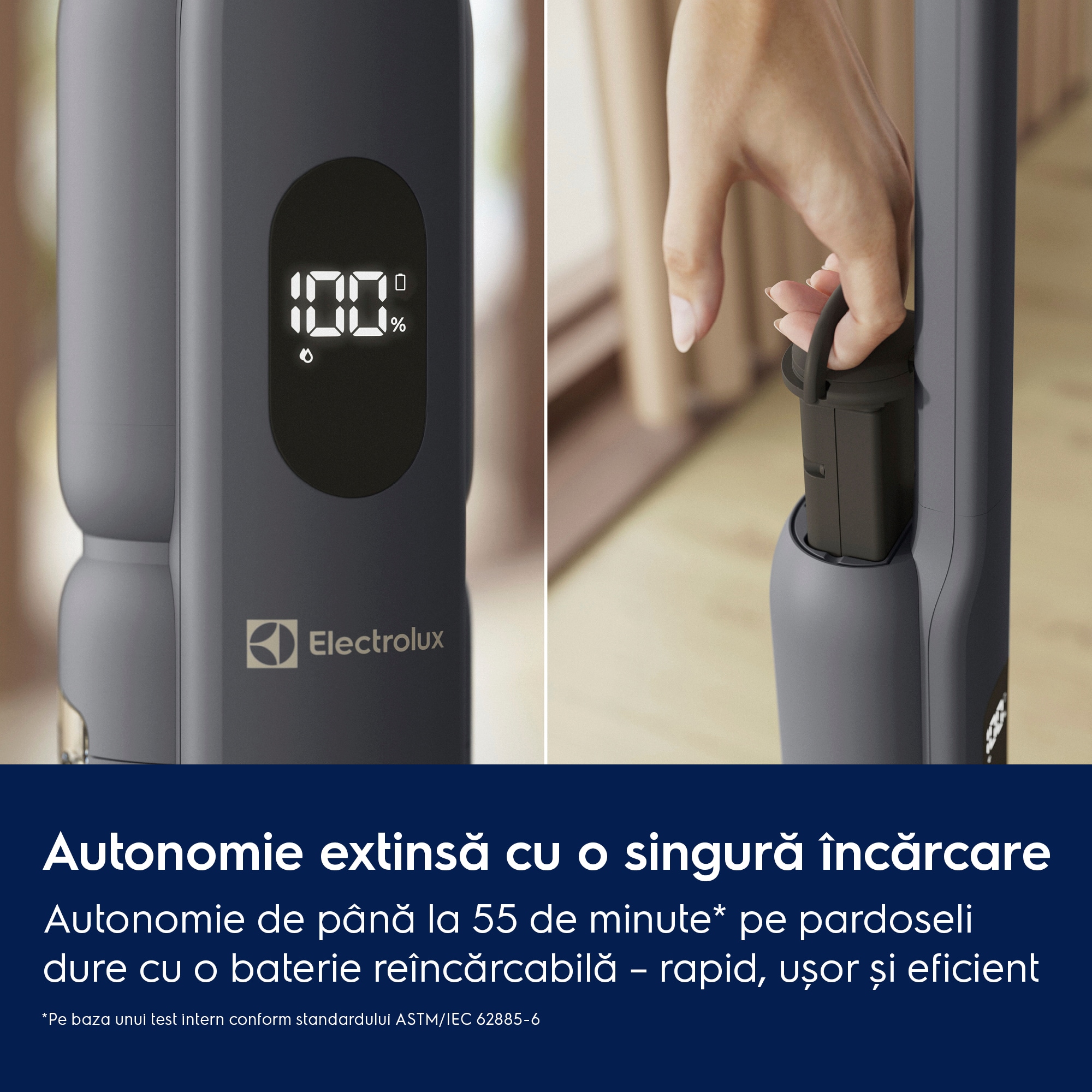 *Pe baza unui test intern conform IEC-62885-6, măsurând timpul de funcţionare pe pardoseli dure.
