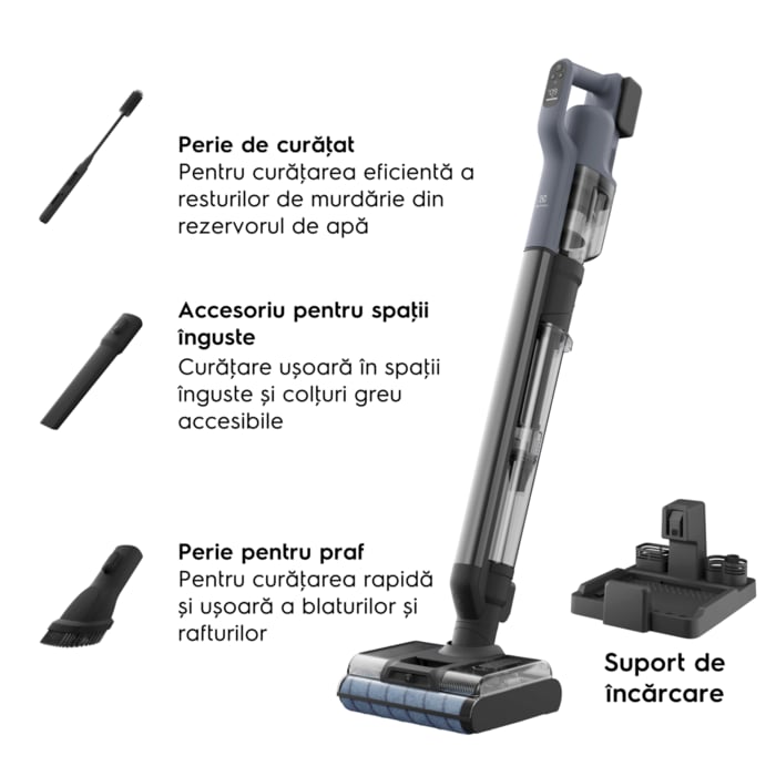 ***Zona de curățare este măsurată conform unui test intern standard Electrolux. Rezervorul de apă trebuie reumplut după 25 de min. Autonomia este calculată pe baza unui test intern conform ASTM/IEC 62885-6.